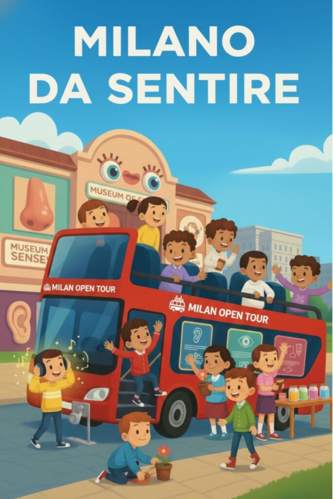 Milan becomes a’open-air classroom: on board a panoramic bus the children recognize the most iconic monuments, train their eye for details and intertwine history, curiosities and urban geography.